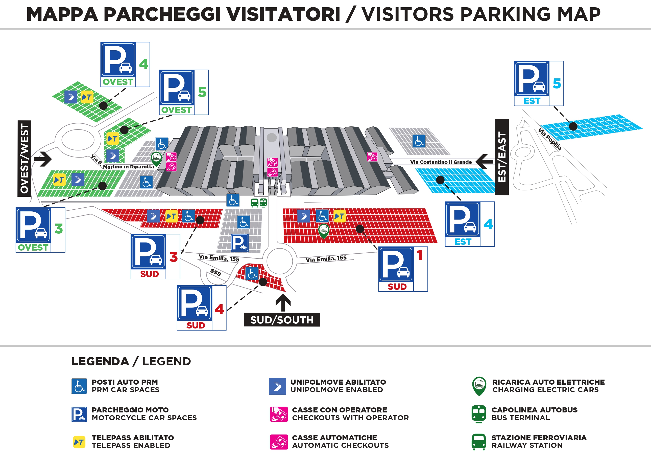 Le aree di stazionamento dei mezzi, identificate con idonea segnaletica, sono ubicate presso l’Ingresso Sud e all’interno dei parcheggi OVEST 1-2 del quartiere fieristico.